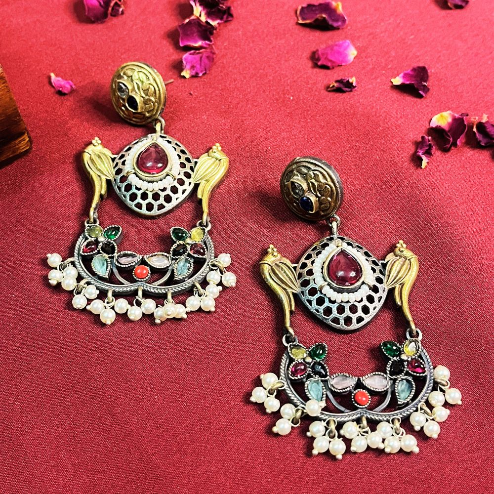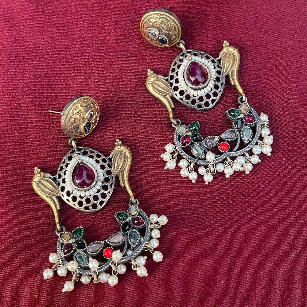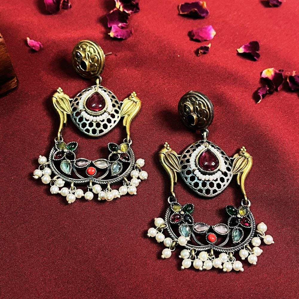 | Length 8.2 cm. Fusion earrings in silver and gold tones are a perfect blend of traditional aesthetics and contemporary charm, crafted to cater to modern tastes while honoring cultural heritage. These earrings are meticulously handcrafted from high-quality brass, ensuring durability and a refined finish. The dual-tone design—combining the elegance of silver with the opulence of gold—creates a versatile accessory that complements both ethnic and fusion attire. The weight and dimensions listed in the additional information include details about the box that contains the product. |