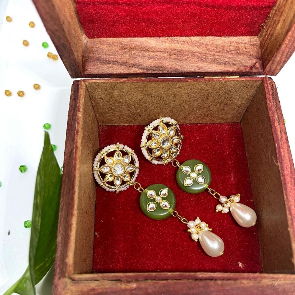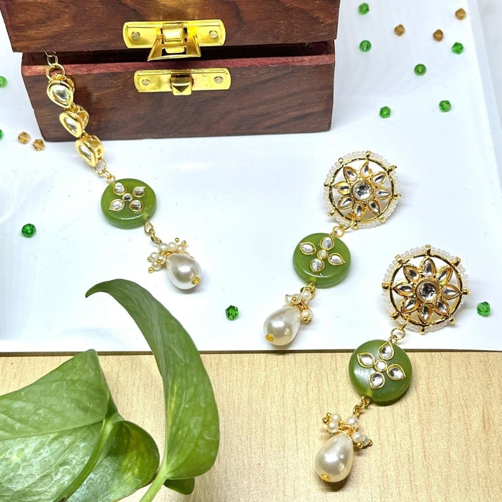 Embrace the aEmbrace the artistry of Mehendi with our exquisite jewelry gift box, crafted to enhance the beauty of the celebration. The box consists of earring and maang teeka.