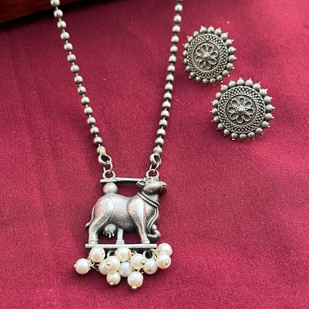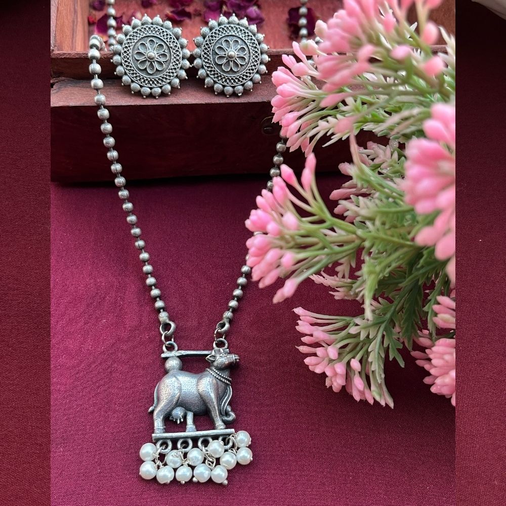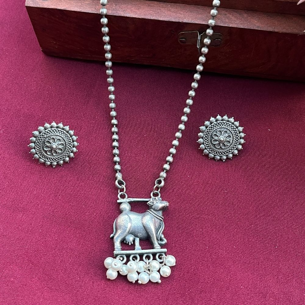 | Length 32 cm. A long brass necklace featuring cow motifs inspired by traditional temple designs embodies elegance and cultural heritage. Lightweight and versatile, it complements various attire, from ethnic ensembles to contemporary outfits, adding a touch of timeless charm. Paired with fusion earrings that blend classic and modern elements, this jewelry set offers a harmonious balance, making it suitable for both festive occasions and everyday wear. The weight and dimensions listed in the additional information include details about the box that contains the product. |