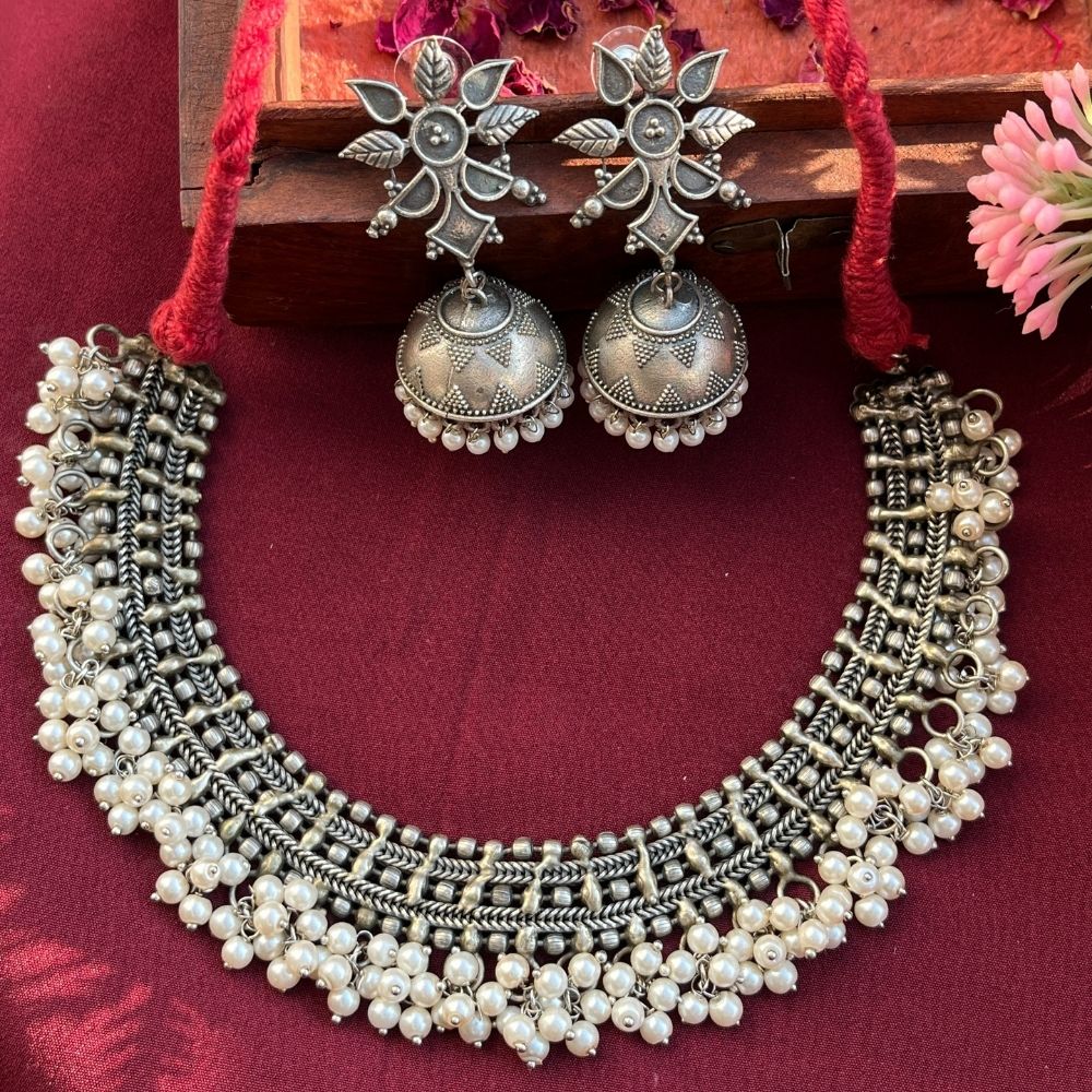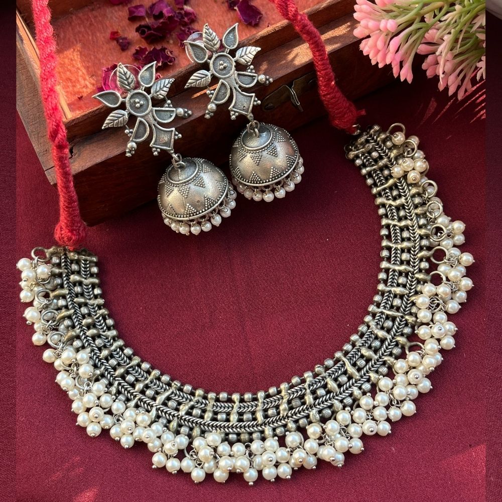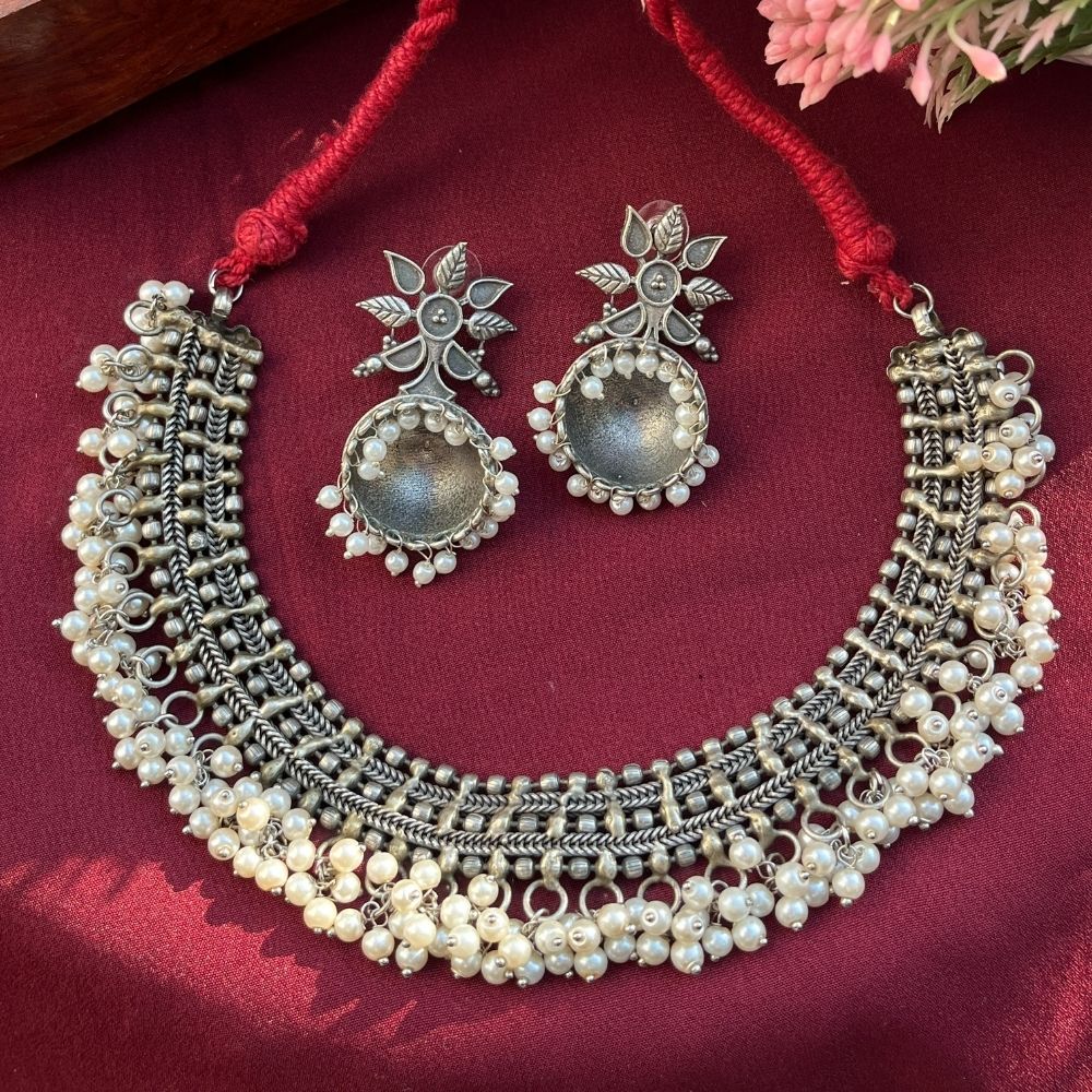 | A handcrafted silver-toned brass choker, accompanied by a pair of exquisite earrings, exemplifies the fusion of traditional craftsmanship and contemporary design. The choker’s intricate detailing and lustrous finish make it a standout accessory, while the matching earrings enhance its elegance, creating a harmonious ensemble. This versatile set effortlessly complements both ethnic and modern attire, adding a touch of sophistication to any ensemble. The weight and dimensions listed in the additional information include details about the box that contains the product. |