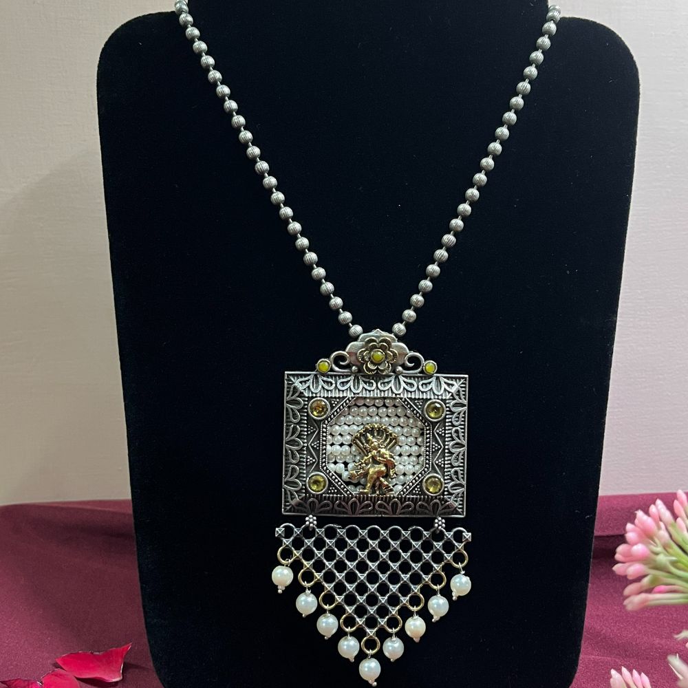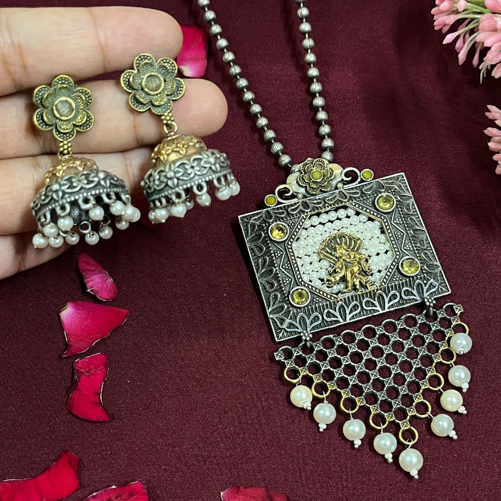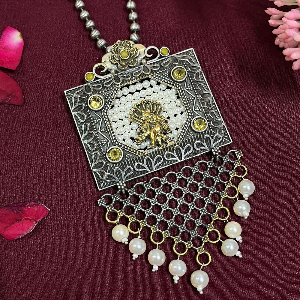 | Introducing the latest addition to our Devalay collection, a stunning long fusion necklace inspired by the divine elegance of Lord Vishnu. This masterpiece combines both gold and silver finishes in intricately designed brass, capturing the essence of traditional temple jewelry with a modern twist. The necklace features detailed motifs that reflect the grace and sanctity associated with Vishnu, making it a perfect choice for the festive season. Its versatile design ensures it complements a range of outfits, adding a touch of sacred beauty to any ensemble. Embrace the spiritual allure and timeless sophistication of this new design, and celebrate the festive season with a piece that embodies divine elegance and craftsmanship. The weight and dimensions listed in the additional information include details about the box that contains the product. |