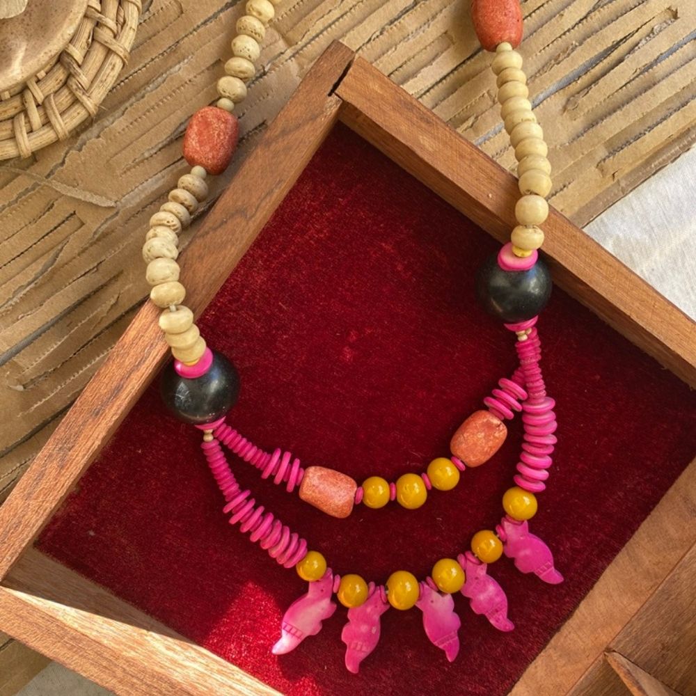 Each piece blends natural materials with artistic flair, creating a unique accessory that adds a rustic charm to any outfit. Perfect for those who value craftsmanship and individuality, this necklace is a true testament to timeless elegance.