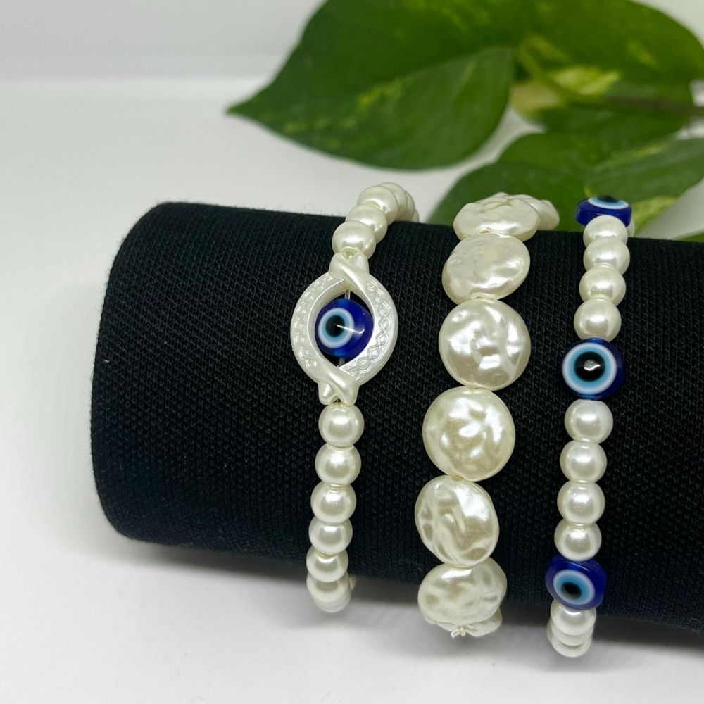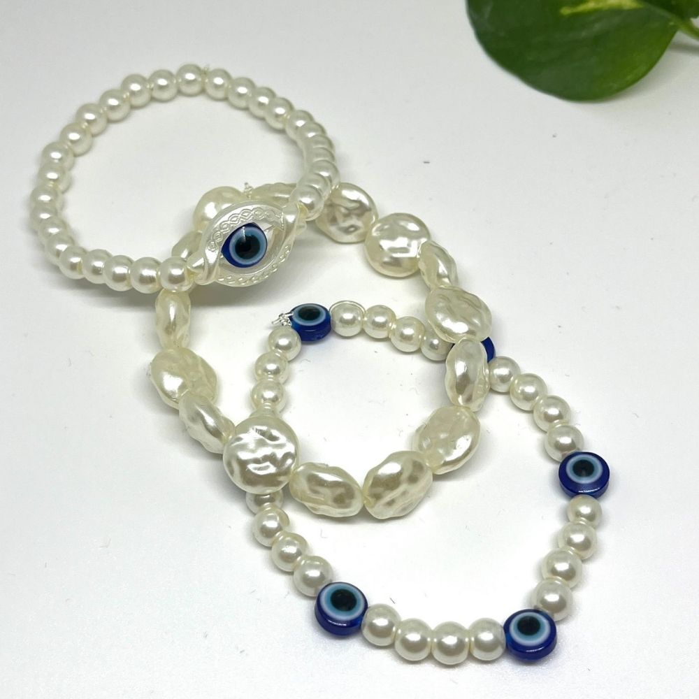 | Elevate your wristwear with our three-layer imitation pearl evil eye bracelet, a chic fusion of mystique and sophistication. |